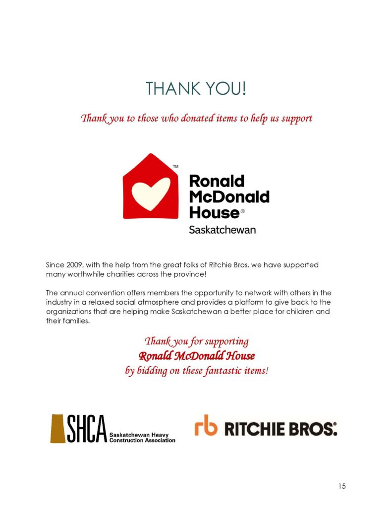 At the upcoming Infrastructure Summit, our longstanding partner, Ritchie Bros. Auctions, will host a special auction on Wednesday, December 4th, to raise essential funds for the Ronald McDonald House expansion project. This initiative will build new Ronald McDonald Houses in Regina and Prince Albert, giving sick children and their families a place to stay together while they receive vital medical treatment close to home.