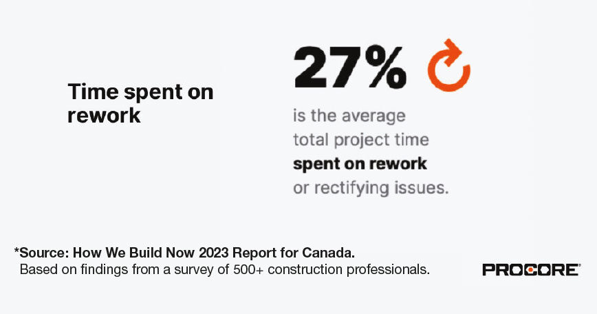 This optimism can be attributed to several factors, including the initiation of large-scale projects such as the Ontario Line subway and clean energy ventures in British Columbia. The growing immigrant population is also driving demand for housing and infrastructure. These factors, coupled with an existing labour shortage, are adding to the industry’s backlog of projects. Lee says that despite industry optimism, the data indicates there is a clear call for embracing technology to address crucial challenges. The survey shows 27 per cent of the total time spent on a project is used for rework or rectifying issues.