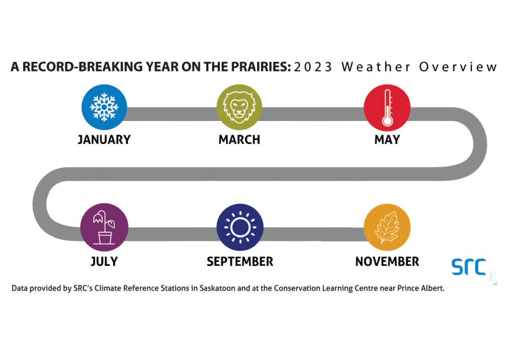 With several longstanding climate records shattered in 2023, Saskatchewan’s weather was right at home in a year full of impactful events. This year, the Saskatchewan Research Council (SRC)’s Climate Reference Station (CRS), located in Saskatoon, logged record amounts of bright sunshine and daily high temperatures, and below average precipitation, making 2023 the fifth driest year on record.