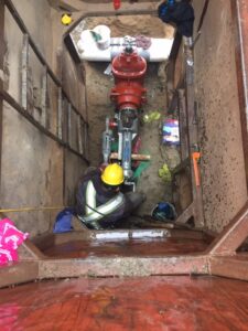 “One of our other specialty services is watermain hot tapping—we can tie into an existing water line without taking it out of service,” said Bast. “This is done with a tapping valve installed on the watermain. Then, we cut into the watermain with a tapping machine by inserting it through the valve, make the cut into the watermain, retract the machine and hook onto the new pipe. That allows us to get the work done without shutting off the water to the whole area.”